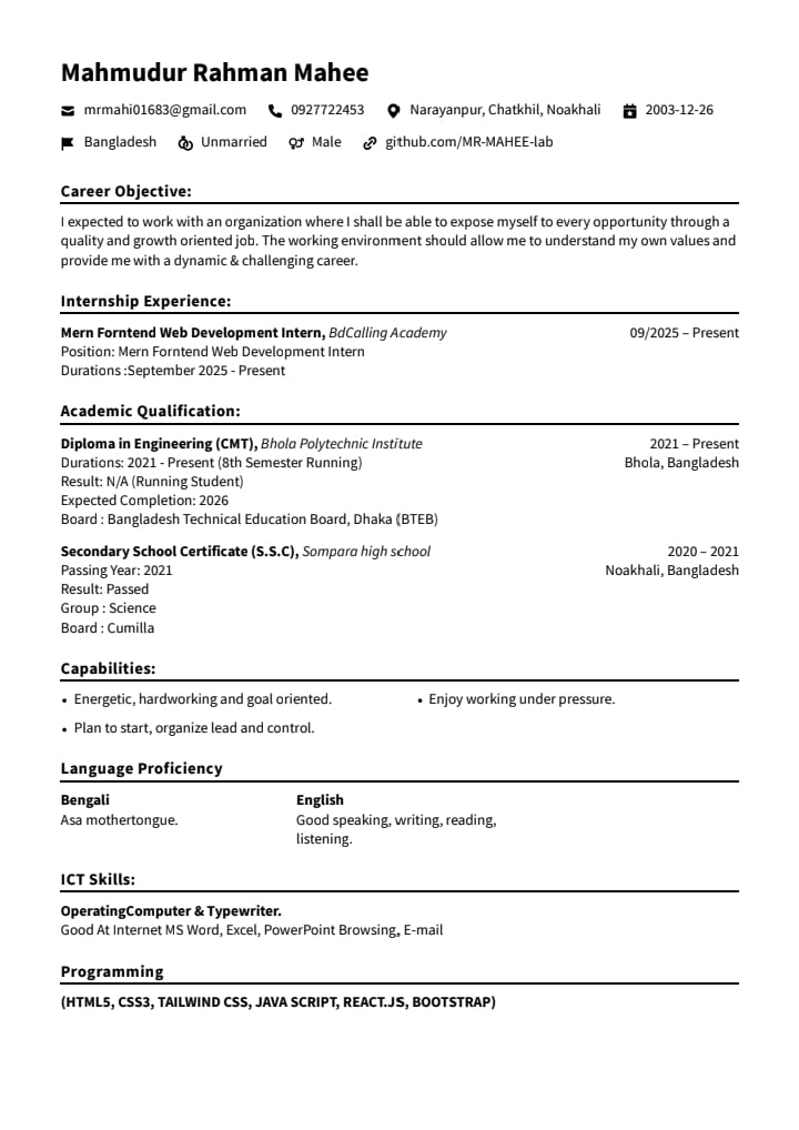 I am a frontend developer from Dhaka, Bangladesh with 2 years of experience in multiple companies like .